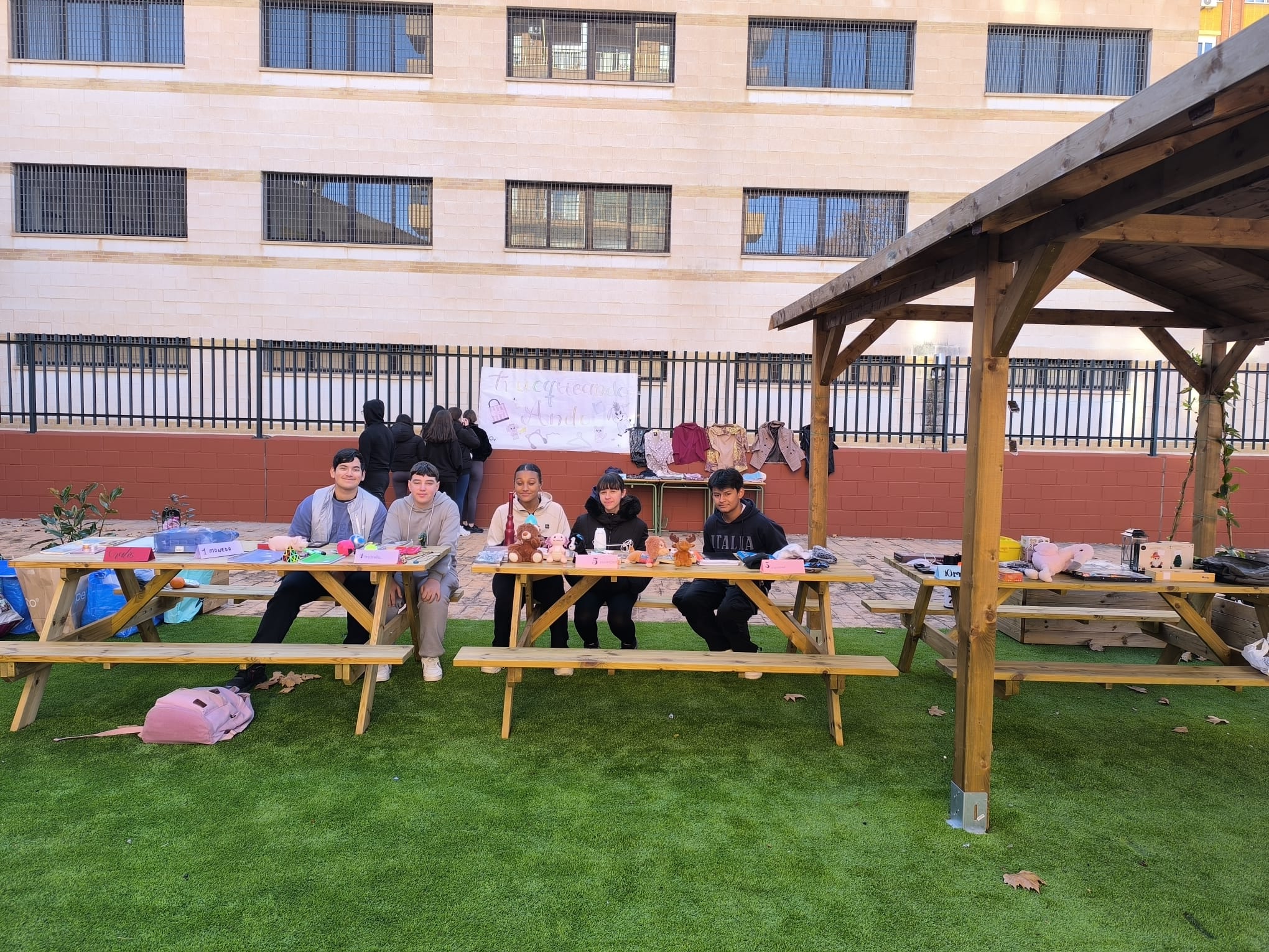 Tres mesas llenas de objetos variopintos, música navideña, un bonito cartel y personas entusiasmadas en el patio…